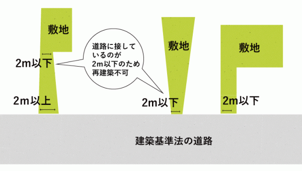 「入り口(接道間口)が2mあるから大丈夫!」と安心するのは少し危険です。入り口は2mあっても、奥の建物を建てるスペースまでの通路の途中に「幅が2m未満に狭くなっている部分」がある場合、再建築が認められません。