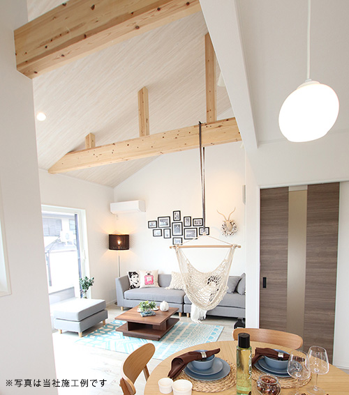 屋根の構造体である梁(はり)を「見せ梁」としてあえて露出させることで、デザインのアクセントになります。木の温もりを感じられるナチュラルテイストや、ダイナミックで個性的な空間を演出できます。