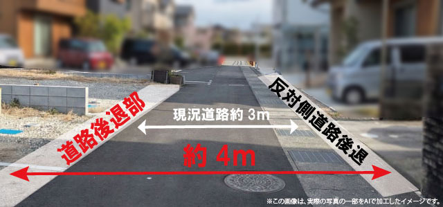 今は少し狭くても、ご近所のお家が順番に新しく建て替わっていくにつれて、少しずつ道が後退(セットバック)されて広がっていきます。将来的にスッキリとした4m道路になり、さらに安全な環境に変わっていきます。