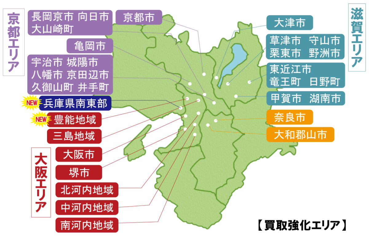現在、弊社では京都府、滋賀県、大阪府北部・東部を仕入れ強化エリアとして活動しておりますが、事業拡大に伴い、更なるエリアの拡大も計画しております。つきましては、新たな活動エリアとして、兵庫県南東部(尼崎市、西宮市、伊丹市、宝塚市、川西市など)の案件情報も広く募集させていただきたく、ご案内申し上げます。